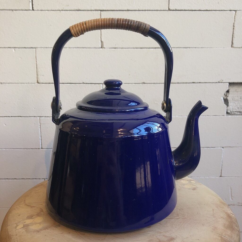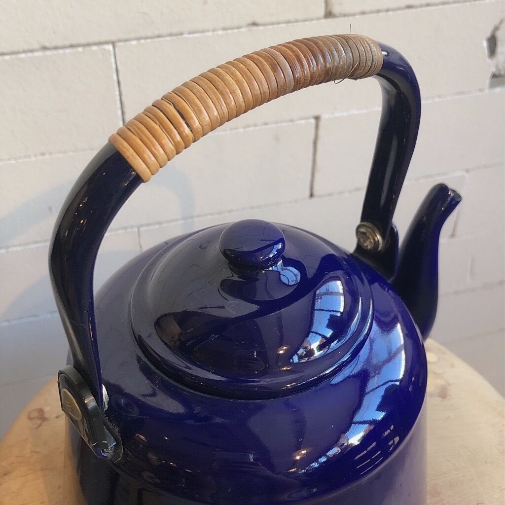 商品説明:籐編み取手のケトルです。色はネイビー