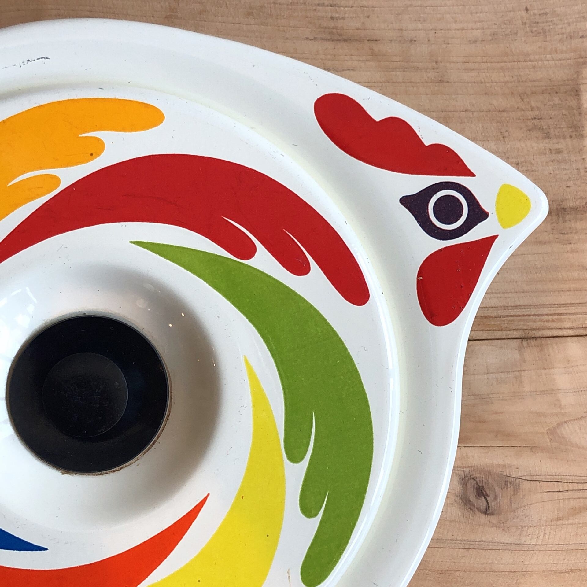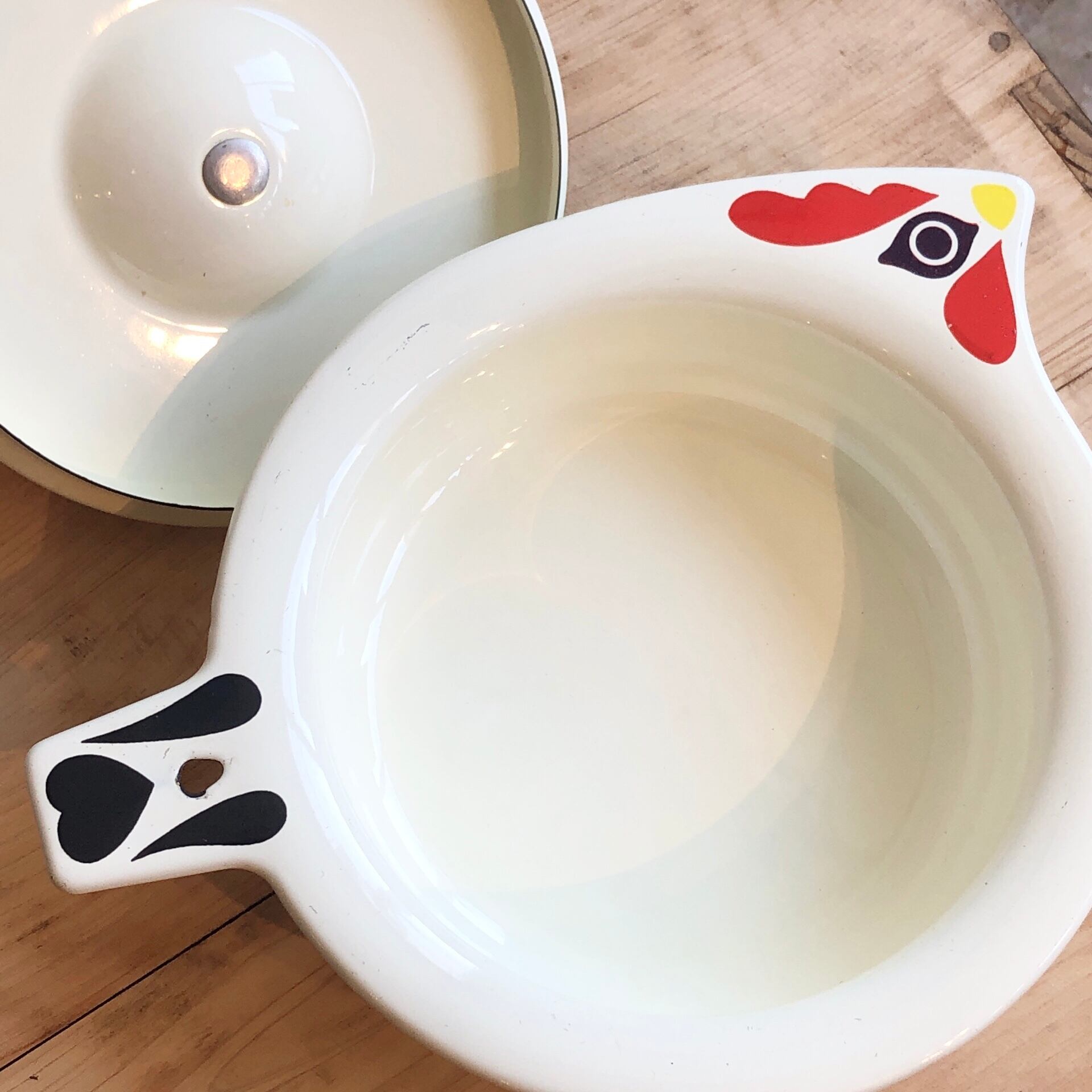 商品説明:レトロでポップな鶏のデザインが可愛いホーロー 皿です。